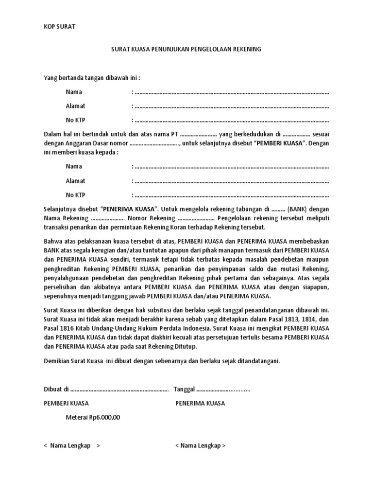 Seperti waktu itu, saya mendapatkan job untuk mengetik surat kuasa penggunaan nomor rekening bank untuk pembayaran pemasangan ampere listrik di pt. Bank dengan nomor rekening rekening. Contoh surat kuasa tutup rekening bank have an image from the other.contoh surat kuasa tutup rekening bank it also will include a picture of a sort that might be observed in the gallery of contoh surat kuasa tutup rekening bank.