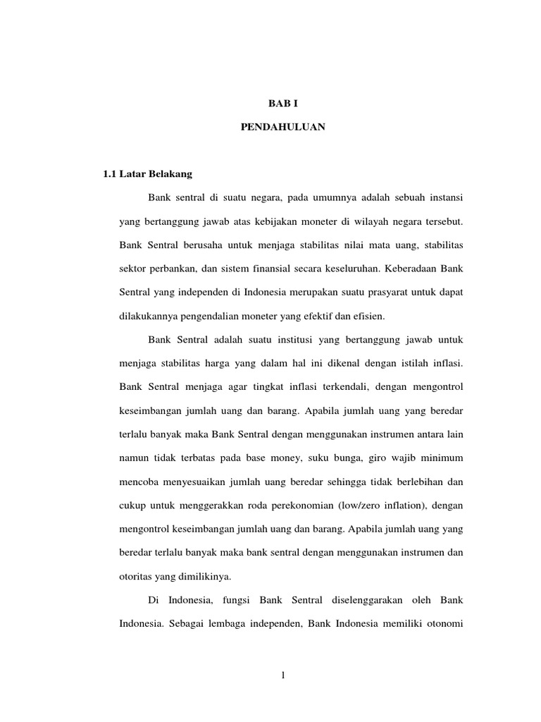 Dalam hal bank indonesia melanggar ketentuan tersebut, maka perjanjian pemberian kredit kepada pemerintah tersebut batal demi hukum. Kedudukan bank indonesia sebagai lembaga negara peranan bank indonesia dalam pengendalian inflasidalam uu ri no. Pada masa itu de javasche bank, nv didirikan di batavia pada tanggal 24 januari 1828 kemudian menyusul nederlandsche indische escompto maatschappij, nv pada tahun 1918 sebagai pemegang monopoli pembelian hasil bumi dalam negeri dan penjualan ke luar negeri serta terdapat beberapa bank yang memegang peranan.